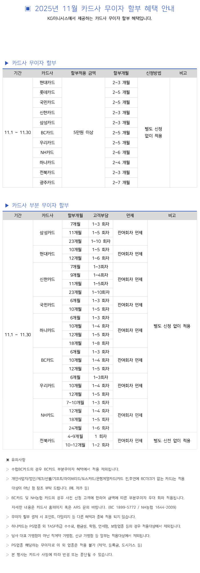 [공지] 2025년 11월 카드사별 무이자 할부안내 |